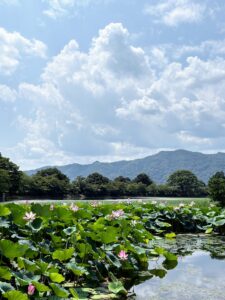 時代劇で海にも湖にも川にもなる大沢池は、蓮も睡蓮も美しい季節だった。