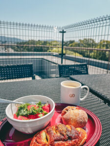 部屋からも二条城のお堀が見えて、6階の屋上からは敷地が少しだけ見下ろせて。なんだか不謹慎な建物だなと思ったりもした。