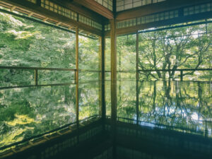 GW明け頃、青にもう少し深みが出た緑のグラデーションの世界も捨てがたい。だけど、大人気の書院の机に映る「瑠璃の庭」は、6月になると苔が”瑠璃光浄土”さながら瑠璃色にキラキラ輝くから、それもいい。