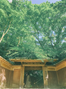 山門を抜けると、「山露地の路」がある。空を見上げて、透けるような緑に手をかざす。青空の青もそのまま、光が抜けてきそう。破けてしまいそうなほど透明で、葉を通り抜けて光が私にさして来る。