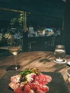 白ワイン越しに見える南座は煌々と輝いていて、屋根は艶やかで落ち着いた気品ある藍色に見える。南座は青いことをこの日初めて知った。