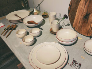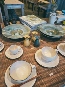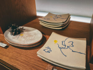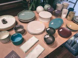 隣には〈HITOHI〉という薪レストランがあって、そこで使っているうつわも並ぶ。奥には陶芸コーナーもあって、ここでもつくってるんだろうな。赤いラインが温かみのある生地感と相まって、めちゃくちゃ可愛い。茶色いご飯が並んでもこれ1枚あったら、食卓が一気におしゃれになりそう。